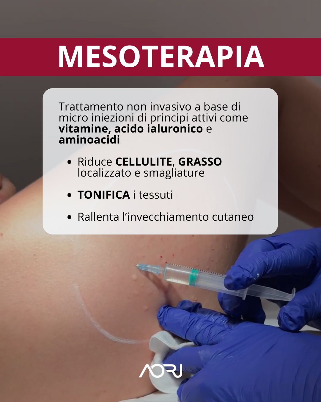 - Mesoterapia → consiste in micro-iniezioni di vitamine, acido ialuronico e aminoacidi che stimolano il metabolismo cutaneo, tonificano la pelle e riducono cellulite e smagliature.