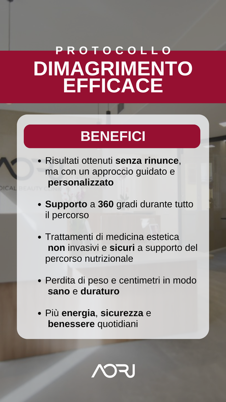 Il Protocollo Dimagrimento Efficace è un percorso multidisciplinare studiato per ottenere risultati concreti e duraturi, combinando nutrizione personalizzata e trattamenti di medicina estetica mirati.